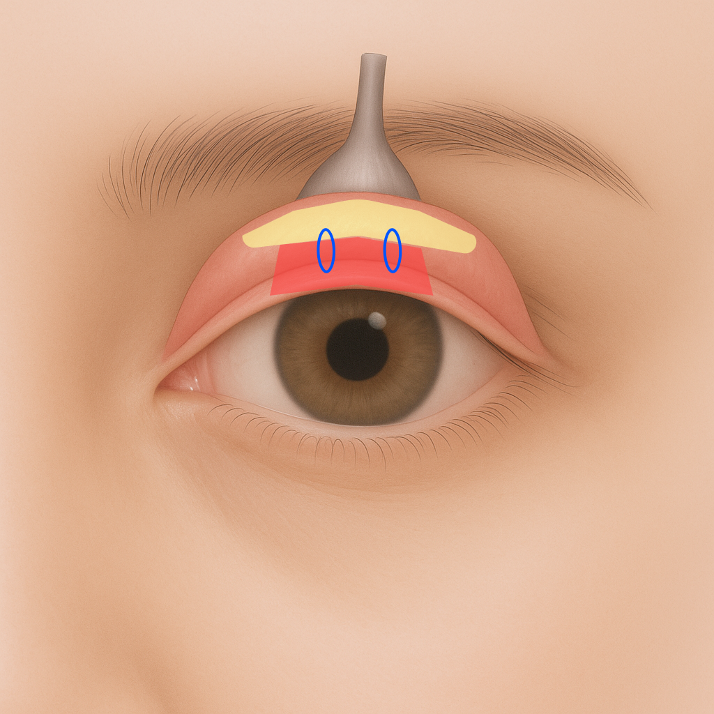 눈꺼풀을 뒤집어서 결막쪽으로 접근하여 안검판과 뮬러근을 연결합니다.