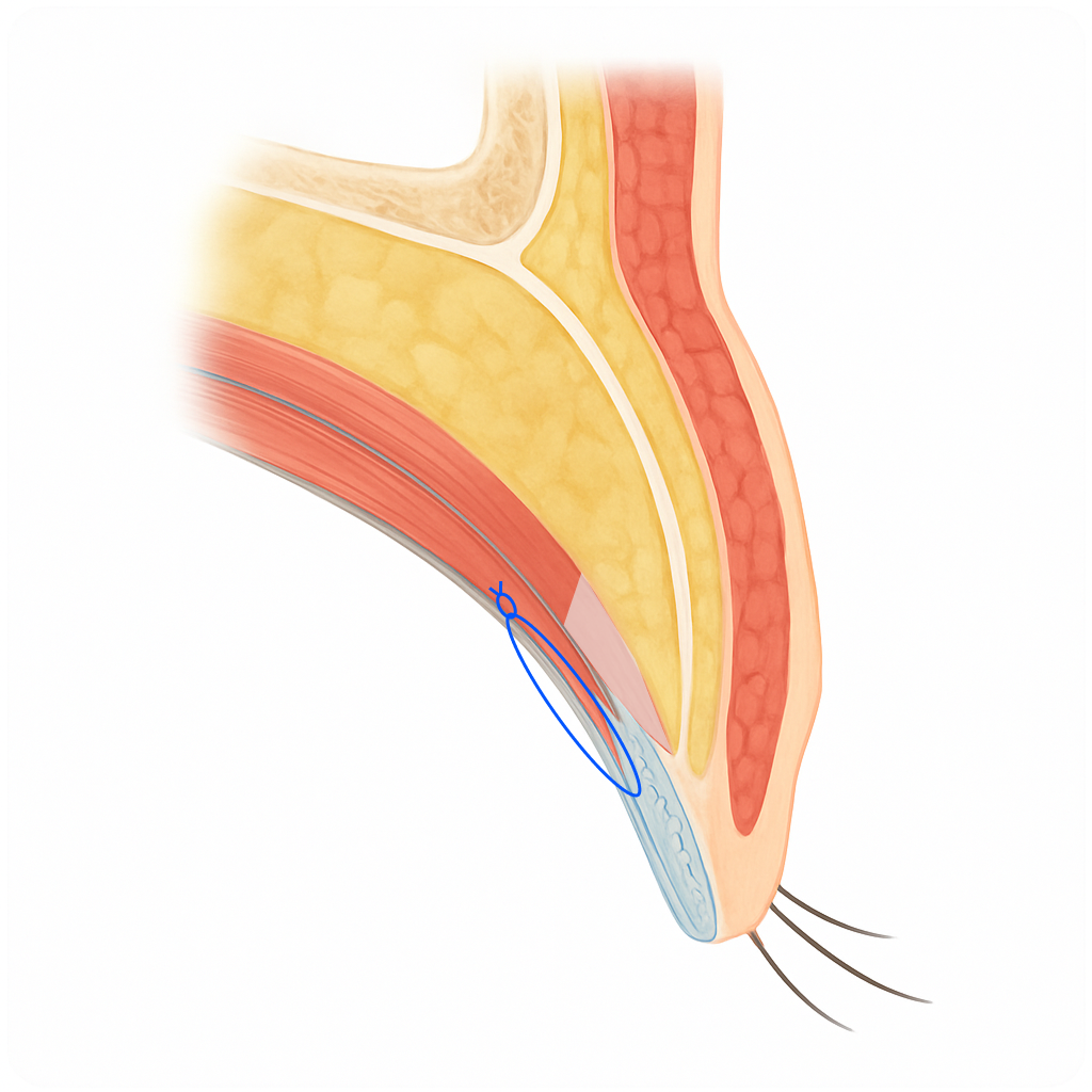 앞쪽 쌍꺼풀 라인 절개창을 이용하여 눈 안쪽으로 접근하여 눈뜨는 근육의 근막의 끝부분을 당겨오거나 절제 후 안검판에 봉합해줍니다.